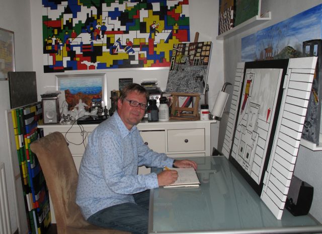 In mijn schilderijen tracht ik een beetje realisme terug te brengen in de stijltechniek van Mondriaan,met een beetje meer kleur en vorm.